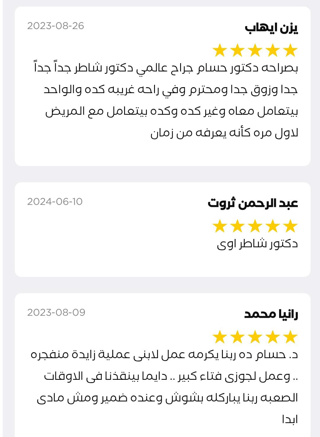 أعلى نسب شفاء وتقييمات إيجابية من المرضى؛ مع سجل يتعدى ١٠٠٠ عملية ناجحة سنويًا جعلت د. حسام متفردًا فى مجاله.